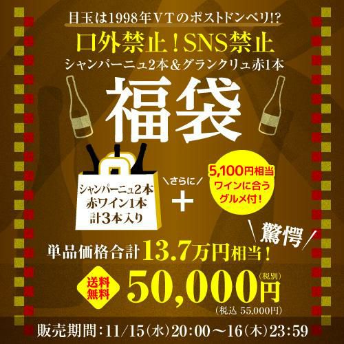 他の画像を見る 本当に口外禁止レベルのすごい福袋! 11/15 16限定 数量限定送料無料口外禁止&SNS禁止 シャンパーニュ2本&赤ワイン1本 137,500円相当が入って55,000円! 5万円(税別)福袋おまけ付 ポストドンペリ グランクリュ入りワイン福袋 フランス ブルゴーニュ シャンパーニュ浜運 ¥ 55,000 税込 お気に入りに登録する 在庫切れ 販売を終了しました。