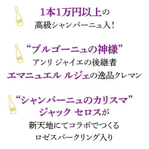 他の画像を見る 特級ヴェルズネイの単一区画による希少シャンパン入り 泡3本福袋 送料無料 69,300円(税込)相当が入って33,000円(税込)! シャンパーニュだけ3本 3万円(税別)福袋 2026 2026年 シャンパンセット 辛口 ワイン福袋 ワインセット 浜運 お歳暮 御歳暮 ¥ 33,000 税込 お気に入りに登録する 在庫切れ 販売を終了しました。