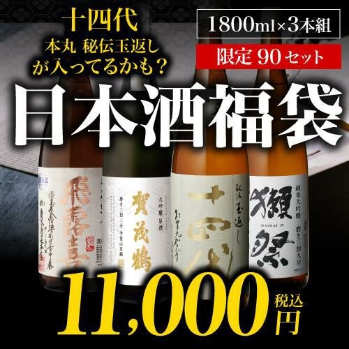 他の画像を見る 十四代が入っているかも!? 日本酒福袋 1800ml×3本セット 第29弾 限定90セット特賞は十四代 飛露喜 獺祭 日本酒福袋 1.8L 清酒 くじ 虎S ¥ 11,000 税込 お気に入りに登録する 在庫切れ 販売期間 2026/03/04 20:00 〜 2026/04/30 23:59
