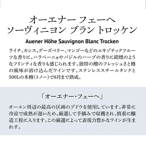 他の画像を見る ナーエのテロワールとブドウの特徴を引き出した村名ワイン オーエナー フェーヘ ソーヴィニヨン ブラン トロッケン 2022 ヘース 750ml ドイツ ナーエ オルツワイン 白ワイン 浜運母の日 父の日 ワインよりどり3本以上5%OFF ワインよりどり6本以上10%OFF ¥ 4,950 税込 お気に入りに登録する