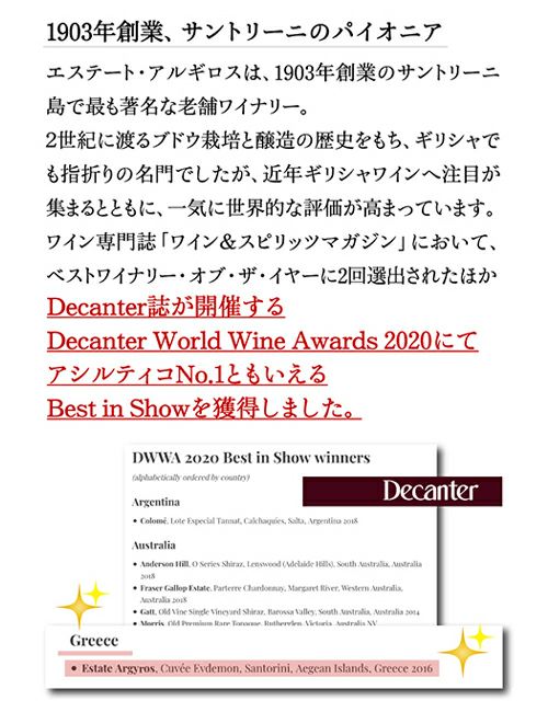 他の画像を見る デキャンター2020でBEST IN SHOW獲得! サントリーニ キュヴェ エヴデモン [2020]エステート アルギロス 750ml ギリシャ アシルティコ 古木 白ワイン 長S ワインよりどり3本以上5%OFF ワインよりどり6本以上10%OFF ¥ 16,500 税込 お気に入りに登録する
