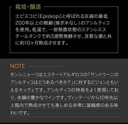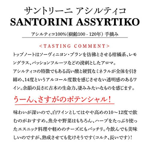 他の画像を見る 平均樹齢1世紀越えの固有品種アシルティコ サントリーニ アシルティコ [2022] エステート アルギロス 750ml ギリシャ 白ワイン 浜運 ワインよりどり3本以上5%OFF ワインよりどり6本以上10%OFF ¥ 4,950 税込 お気に入りに登録する