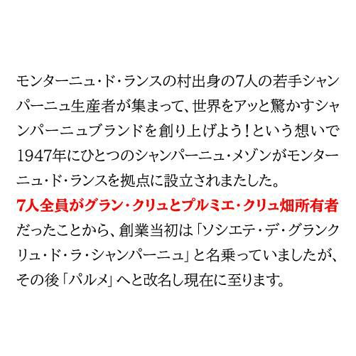 他の画像を見る ブランドブランとダブルで2年連続世界一! 送料無料パルメブラン ド ノワール 正規品 750mlヴァレ ド ラ マルヌ シャンパン 辛口 シャンパーニュ ワインよりどり3本以上5%OFF ワインよりどり6本以上10%OFF ¥ 13,200 税込 お気に入りに登録する