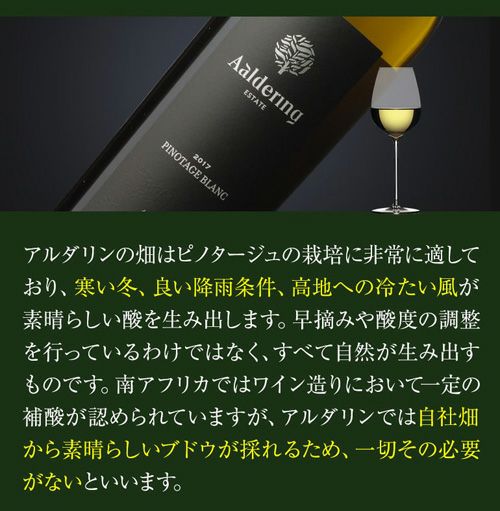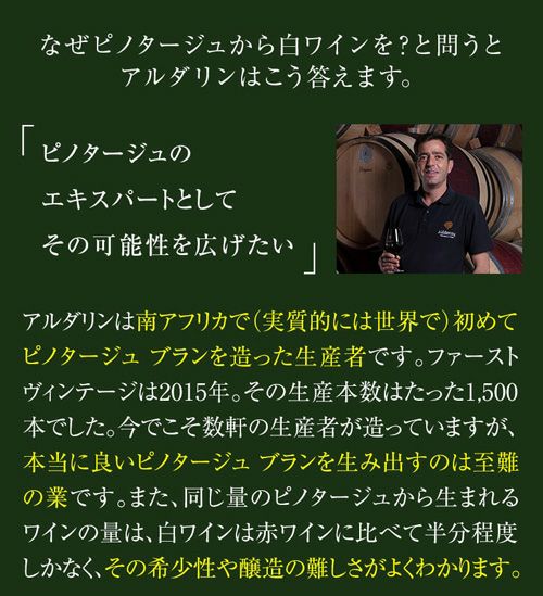 他の画像を見る 珍しいブラン・ド・ノワールの南ア白ワイン! 【送料無料】アルダリン ピノタージュ ブラン 2024 750ml 南アフリカ ステレンボッシュ ブランドノワール 白ワイン 浜運 ワインよりどり3本以上5%OFF ワインよりどり6本以上10%OFF ¥ 5,280 税込 お気に入りに登録する