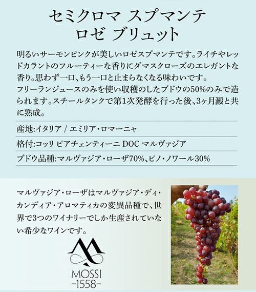他の画像を見る マルヴァジア・ローザとピノのユニークな味わい セミクロマ スプマンテ ロゼ ブリュット MOSSI 1558 750ml 辛口 イタリア エミリア ロマーニャ スパークリングワイン 浜運A ワインよりどり3本以上5%OFF ワインよりどり6本以上10%OFF ¥ 2,750 税込 お気に入りに登録する