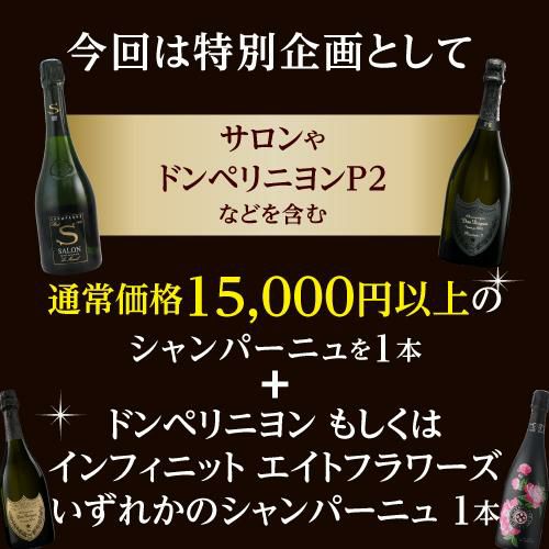 他の画像を見る 創業35周年記念企画 単品価格合計3万円以上のシャンパン2本入 リカーマウンテン 創業35周年記念 シャンパン 2本入 福袋 2.35万円(税別) 1本30万相当のサロンが入ってるかも!?さらに5セットに1セットの確率でドンペリ入50セット限定シャンパン サロン ドンペリ ドラピエ 有名シャンパン入 お一人様1セットまで予約 2025/4/28以降発送予定 ¥ 25,850 税込 お気に入りに登録する 在庫切れ 販売期間 2025/04/24 19:00 〜